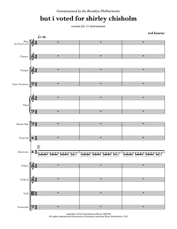 But I Voted for Shirley Chisholm was commissioned by the Brooklyn Philharmonic in 2012. This short overture integrates cut-up samples from Biz Markie's 1988 song "Nobody beats the biz" which include the following lyrics: "Make you co-operate with the rhythm / that is what I give ‘em / Reagan is the Prez’ but I voted for Shirley Chisholm.” Since then, various hip-hop artists have appropriated this lyric in their own work: Redman+ Method Man in 1999 (“Clinton is the president, I still voted for Shirley Chisholm”) and LL Cool J in 2006 (“George Bush is the Prez, but I voted for Shirley Chisholm”) among them. This piece is both a tribute to Shirley Chisholm, and an exploration of the way sampling can embed a dialogue among musicians into a piece of music.