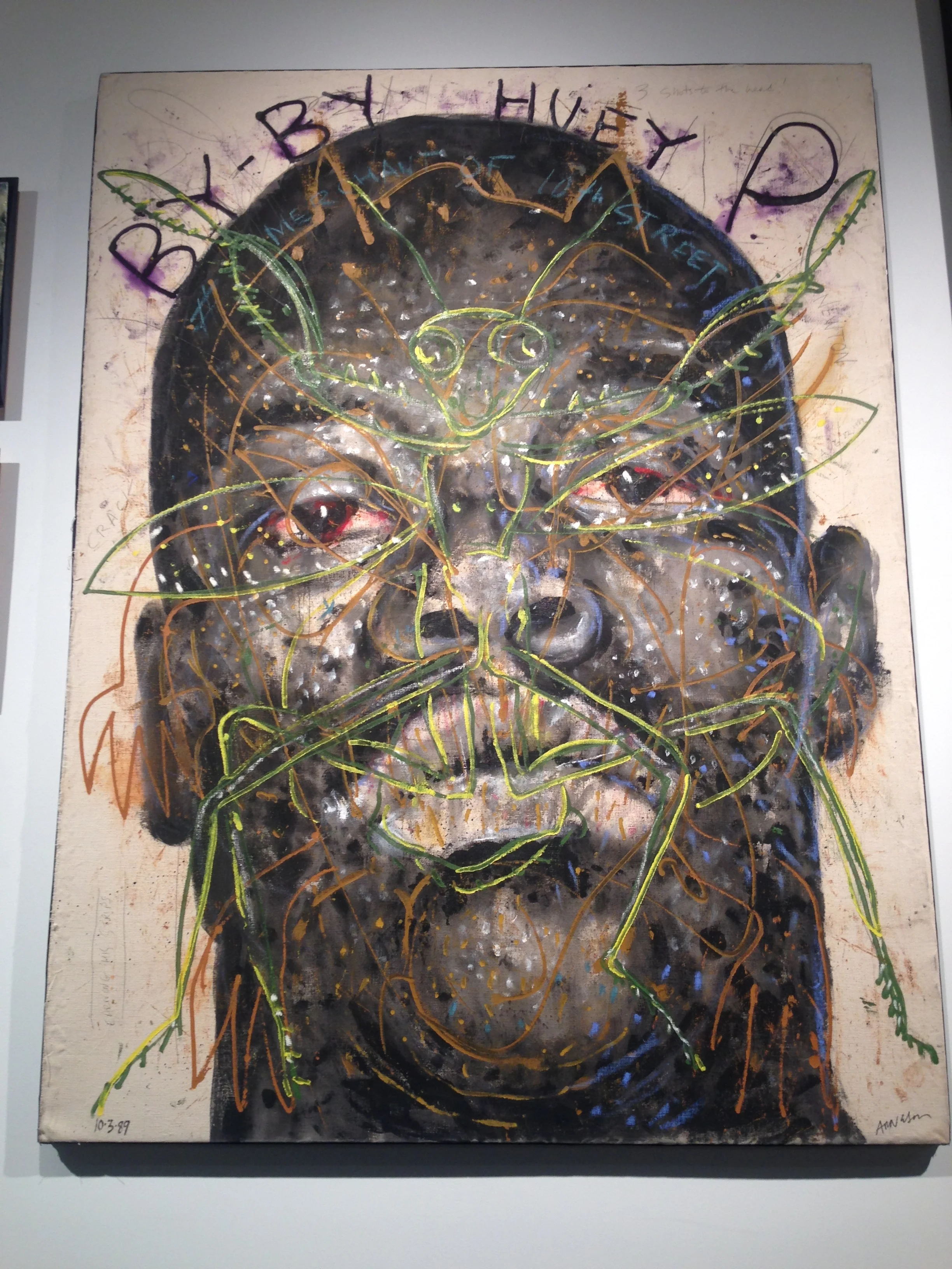 notes Robert Arneson’s painting “Bye Bye Huey P.” is a portrait of 24-year old Tyrone “Double R” Robinson, who murdered Huey P. Newton (co-founder of the Black Panther Party) in 1989. Robinson, a member of the Black Guerrilla Family, is painted with a giant praying mantis superimposed over his face, its wings circling Robinson’s bloodshot eyes. When I saw this work at the Frankel Gallery, my guide told me Arneson included the mantis in the portrait because “they eat their own.”
