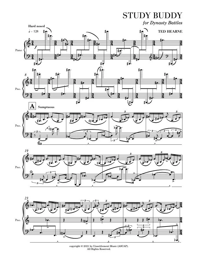 Study Buddy is a short and pugnacious etude written for Dynasty Battles. In the piece, machine-like sputterings of precisely-aligned octave jumps alternate with sections defined by rhapsodic gestures inspired by a speed-addled rendition of Rachmaninoff. It’s an ode to the Romantic etude and an homage to Dynasty's multistylistic musical background.