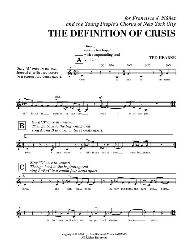 The Definition of Crisis was written for the Young People’s Chorus of New York City, as part of the Alone Together commissioning project. A round in five parts, this piece can be sung by youth choirs of various skill levels.